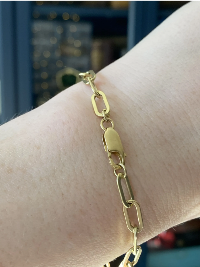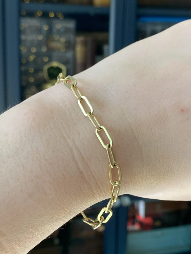 This lovely paperclip bracelet is made in 14ct yellow gold, weighing in at a lovely 9.04 grams and has a very versatile length of 7.75in/19.5cm. It's best to wear solo, use as the base for a charm bracelet, or even to use as a filler/layer in a lovely wriststack.