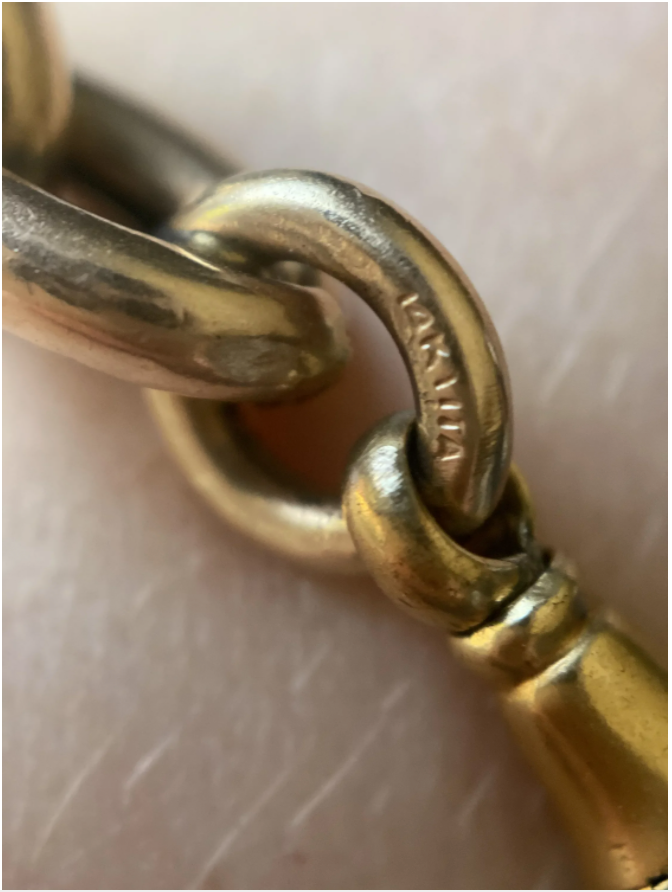 This babe is a hollow link crafted in 14ct yellow gold with a superb weight of 15.96g. It has an unmatched (maker/origin) unmatched dogclip. This beauty comes in at a very wearable and wrist-stackable length of 8.5in/21.5cm.