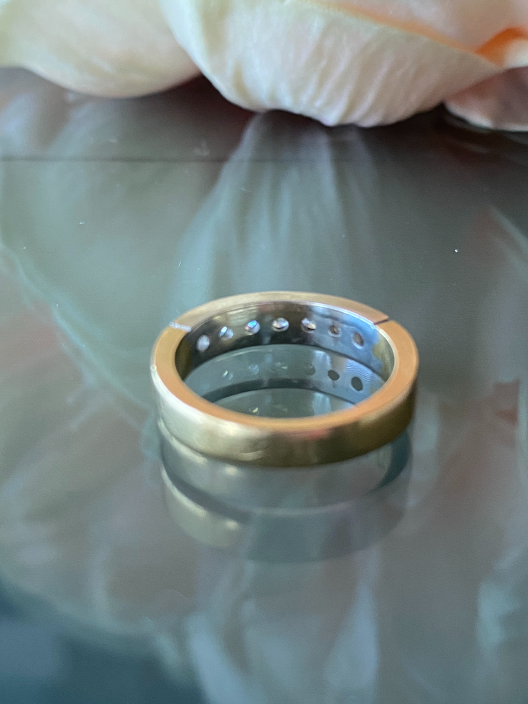 This is a small ring that has a big of a presence! This would be quite easy for your local bench to size up is needed. Comprised of 18ct white and yellow gold it gives the perfect blend for anyone looking to add a little pizzaz to their hand or ring stacks.