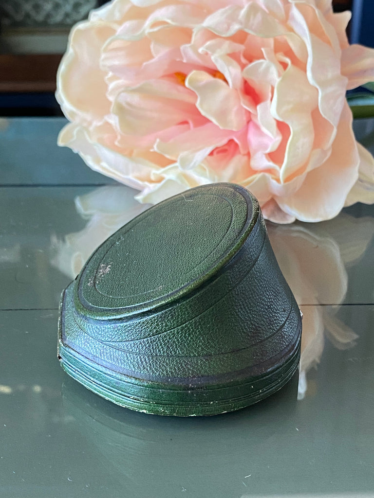 This green leather bracelet presentation box is in very good condition for it's age. This is a rare horseshoe shaped bracelet box with one side elongated to allow for a ornatmentation on the original bracelet (oh to have seen what came with this box). There is a sweet and delicate tooling pattern that goes along the outside rim of the lid with additional tooling on the flat top of the box. The interior has a light sea green velvet and silk, there is staining present (viewable in photos). This would be a beautiful home to part of your collection. The box has a firm and tight closure.