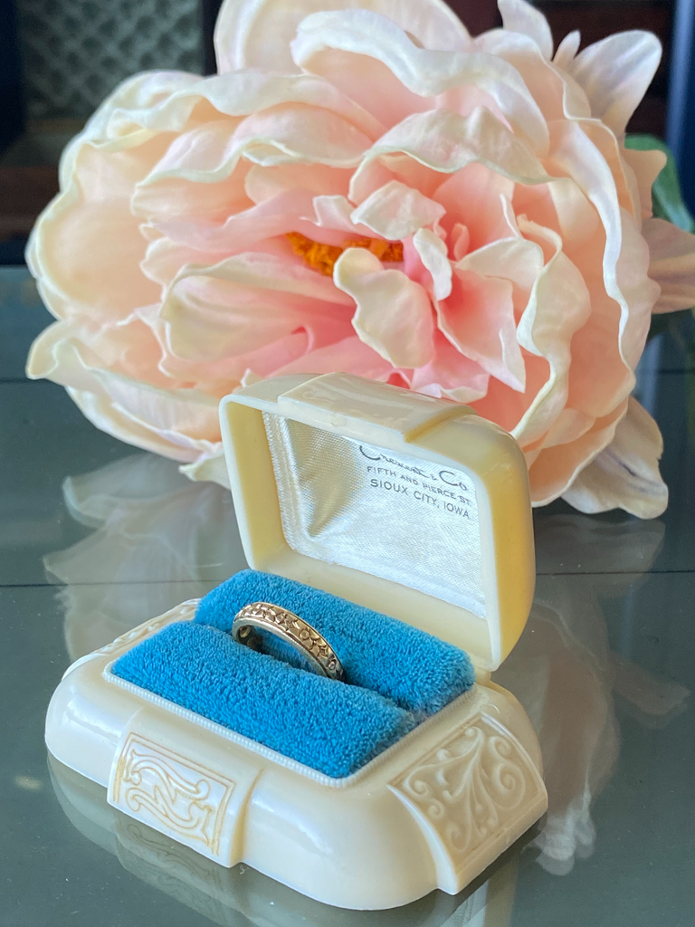 This cream lid with gold tone wash over celluloid ring presentation box is in excellent condition. The teal velvet pad is the perfect extra pop for any ring you chose to put in this box. Crescent & Co. Jewelers was located in Sioux City, IA. Hinge spring is a bit loose, but lid stays up without issue.