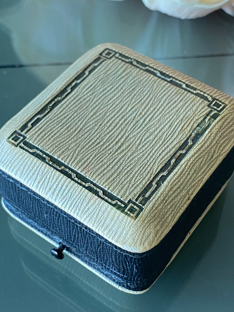 This green-on-green waxed canvas ring box is the epitome of charm that we saw as the Edwardian Era transitioned into Art Deco. Here you'll find two different patterns in the toolings, one on the lid and the other going around the sides of the box on both the top and bottom. The interior of the box features two new shades of green-on-green, again with embossed and tooled patterning. The velvet ring pad shows some discoloration due to age/use and the lid is lined in a pale yellow silk featuring it's original shop name and location. On the exterior the box has a push button closure, box closes with a tight snap. Box is stamped on the bottom for having been made in Germany.