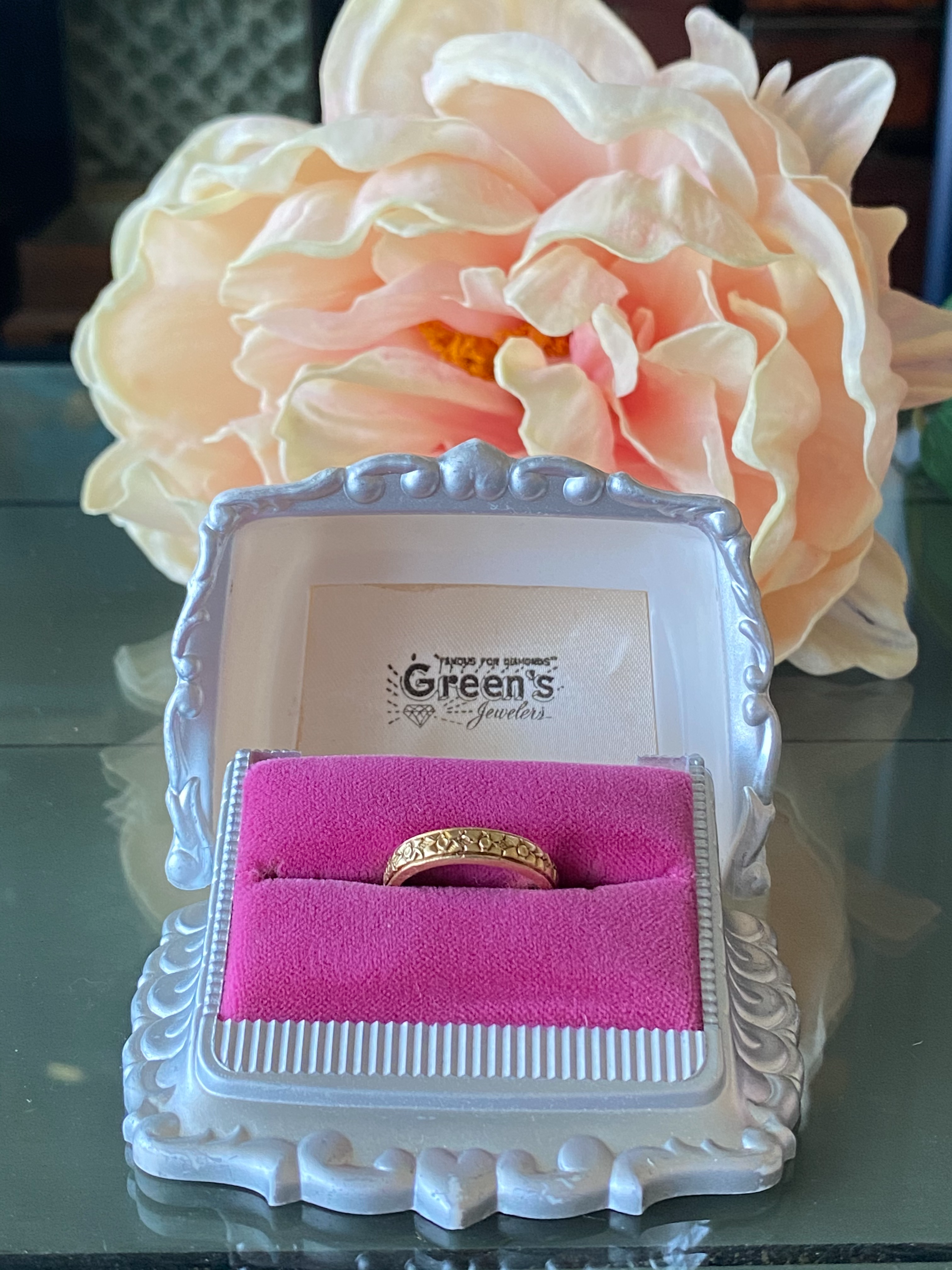 This two tone cream lid with silver base celluloid ring presentation box is in excellent condition. The shape is a modified clamshell and when opened reveals hidden heart motifs within the silver edging. The Pink velvet pad is the perfect extra pop for any ring you chose to put in this box. Green's Jewelers was located in Corpus Christi, TX.